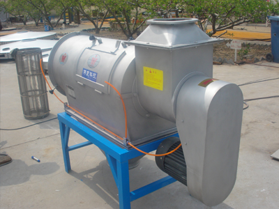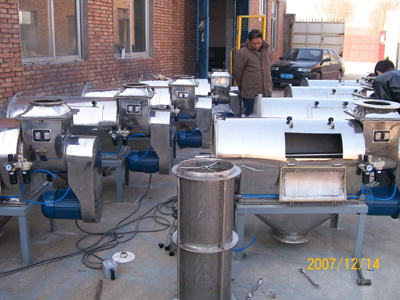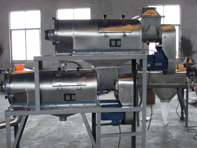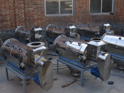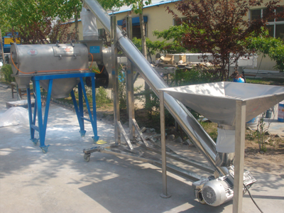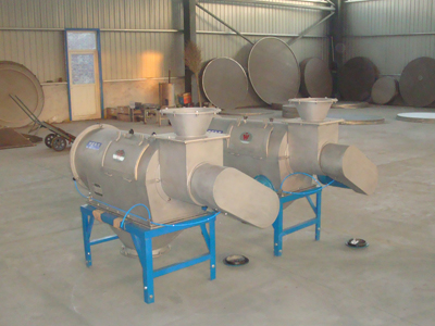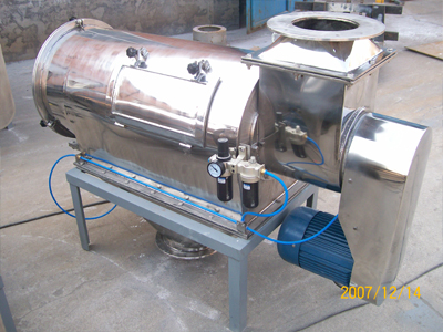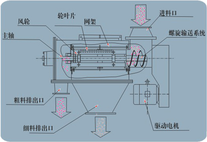 本設(shè)備篩網(wǎng)為圓筒狀,置于機體內(nèi),物料通過螺旋輸送系統(tǒng)后,和氣流混合、霧化進(jìn)入網(wǎng)筒內(nèi);通過網(wǎng)筒內(nèi)風(fēng)輪葉片使物料同時受離心力和旋風(fēng)推進(jìn)力,從而迫使物料噴射過網(wǎng),由細(xì)料排出口排出,不能過網(wǎng)的物料沿筒壁從粗料排出口排出。
